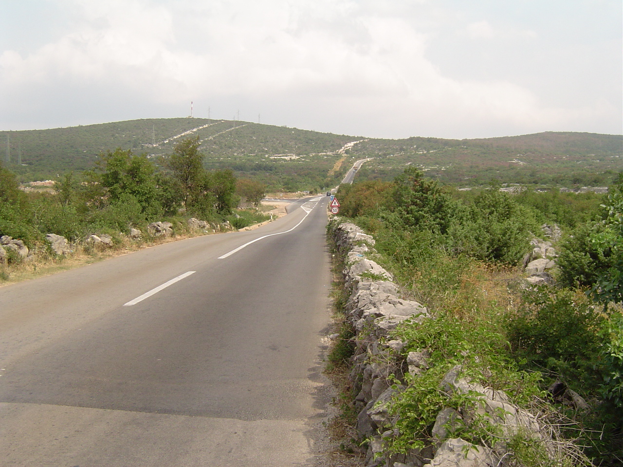 | Dolgi ravni vzponi vodijo do prelaza, od koder se cesta spušča proti Baški. |