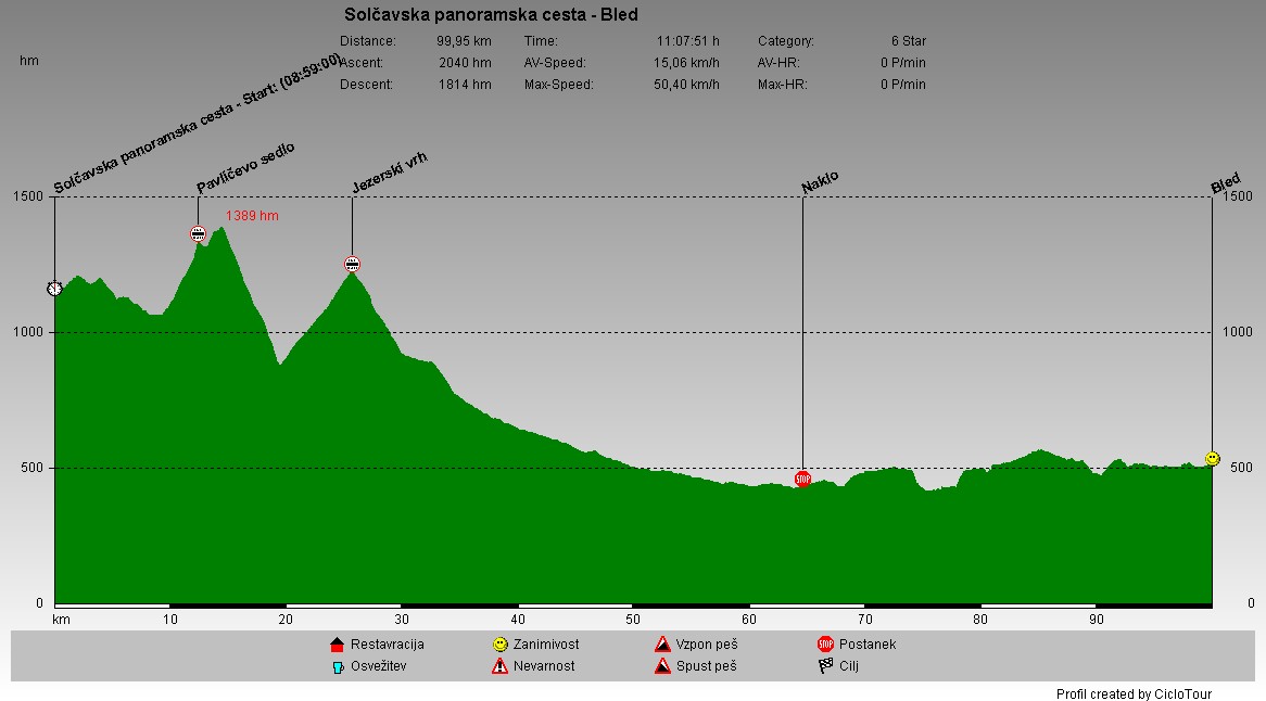 | Po panoramski cesti sem nadaljeval do Pavličevega sedla, kjer sem prečkal mejo in se po Avstriji spustil do 900 metrov višine. Sledil je ponovno vzpon do Jezerskega vrha, potem pa se je cesta spuščala vse do Ljubljanske kotline. Po Gorenjski sem ta dan nadaljeval še do Bleda. |
