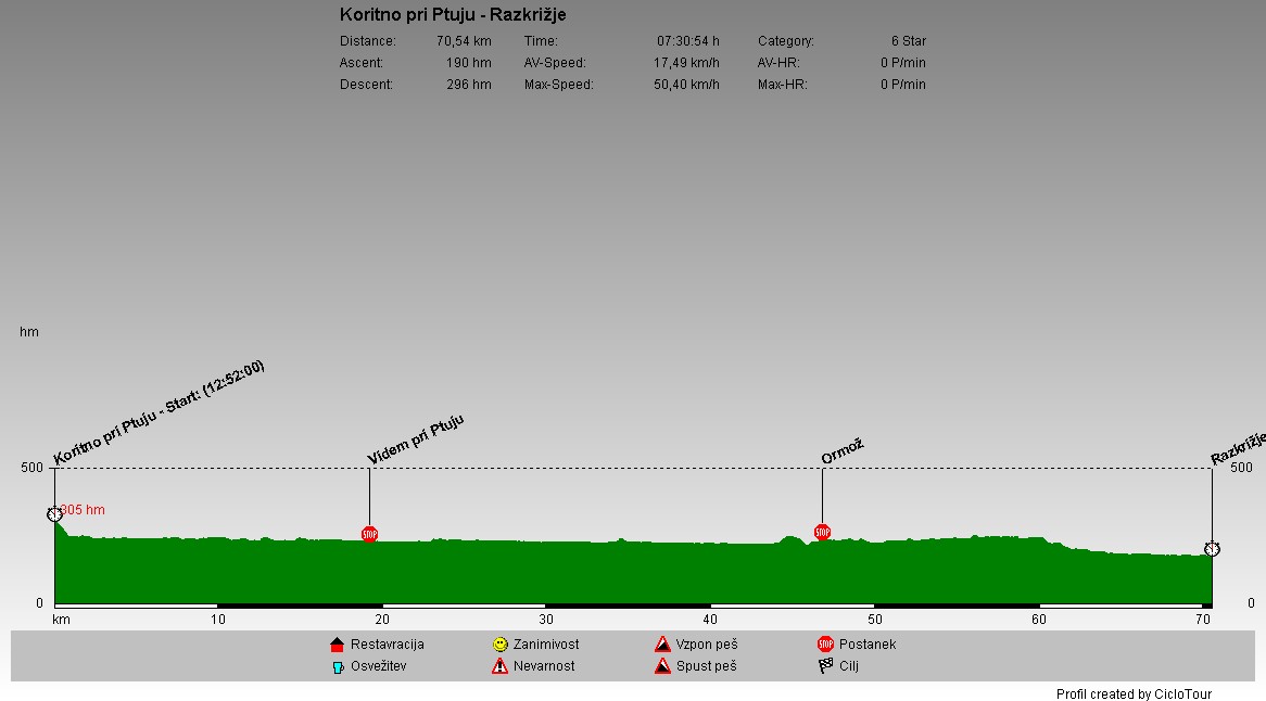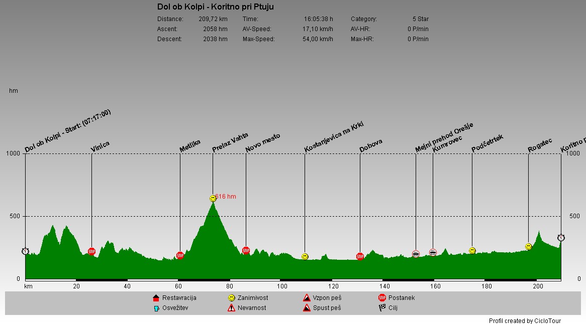 | Ta dan je bila za mano najdalšja pot. 210 kilometrsko razdaljo sem pričel zgodaj zjutraj, ko sem se od Kolpe odpravil proti Beli krajini. Po njenem robu sem prišel do Gorjancev, kjer sem se povzpel na 616 m visok prelaz Vahto. Spust do Novega mesta je bil prekinjen zaradi dežja, vendar se je vreme popravilo in lahko sem nadaljeval po Krški kotlini vse do Dobove. Sledila je pot proti Kozjanskemu. Vendar sem se klancu čezenj izognil tako, da sem še enkrat vstopil na Hrvaško ozemlje. Kmalu za Kumrovcem, ko sem bil ponovno nazaj v Sloveniji, je sonce zašlo, tako da sem od Podčetrtka naprej peljal v mraku, kasneje pa tudi po trdi temi. Z Rogatca sem se povzpel proti Donački gori, za tem pa je sledil še zaključni spust do Koritnega pri Ptuju. |