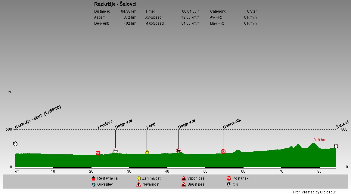 | To je bil dan Prekmurja. Kmalu po odhodu sem že prečkal reko Muro, nato pa se po ravnini peljal skozi Lendavo in Dolgo vas. Prestopil sem mejo in po Madarski prevozil 8 kilometrov do mesta Lenti. V Slovenijo sem se vrnil po isti poti, nato pa sem se odpravil proti severu. Kmalu se je ravnina končala in pričelo se je Goričko. Na skrajnem severovzhodu države sem prespal. |