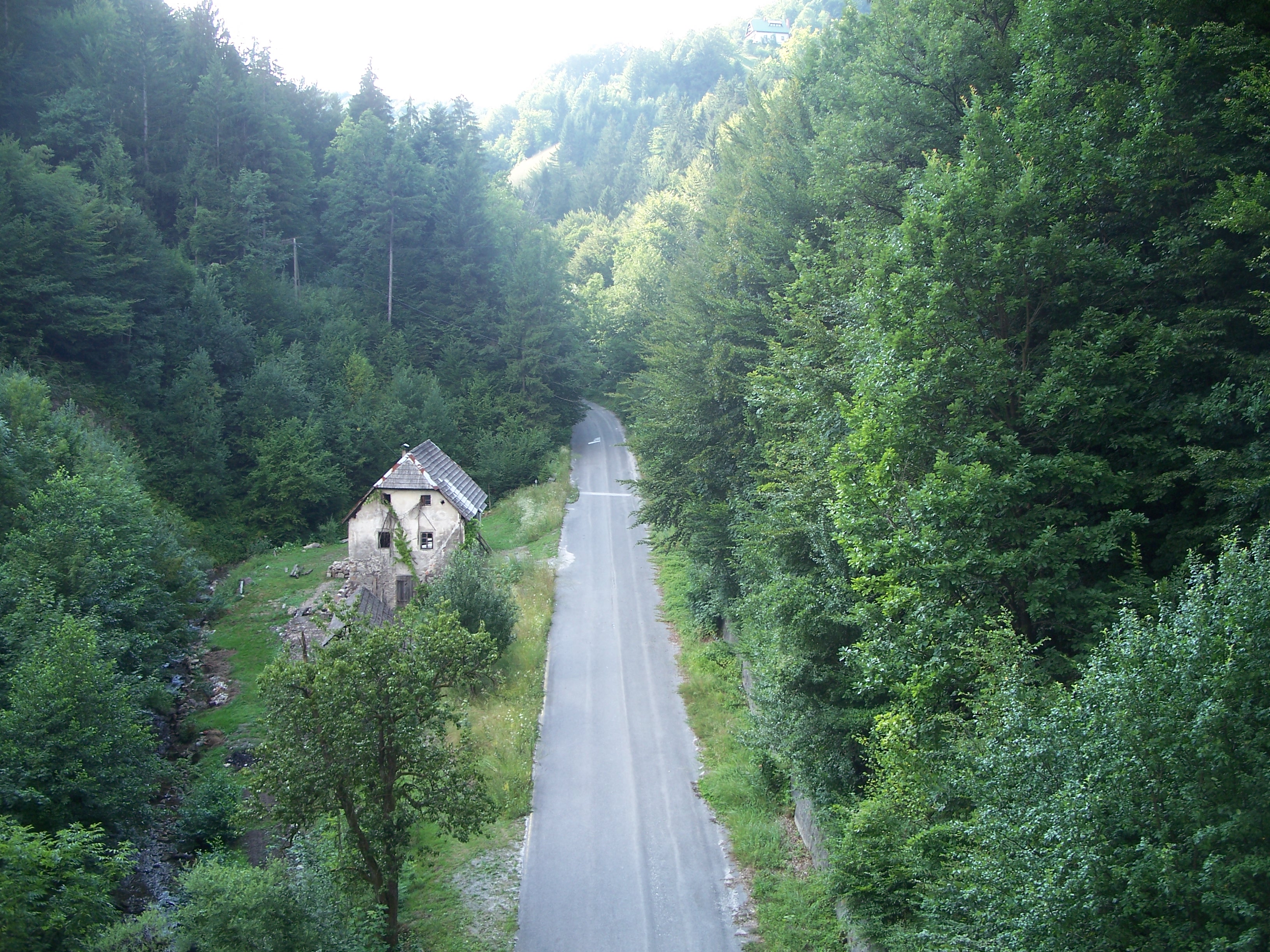 | Z viadukta Baba se lahko vidi še starejša cesta, ki že kar nekaj časa ni v uporabi. Tudi hišo ob njej že krepko najeda zob časa. |