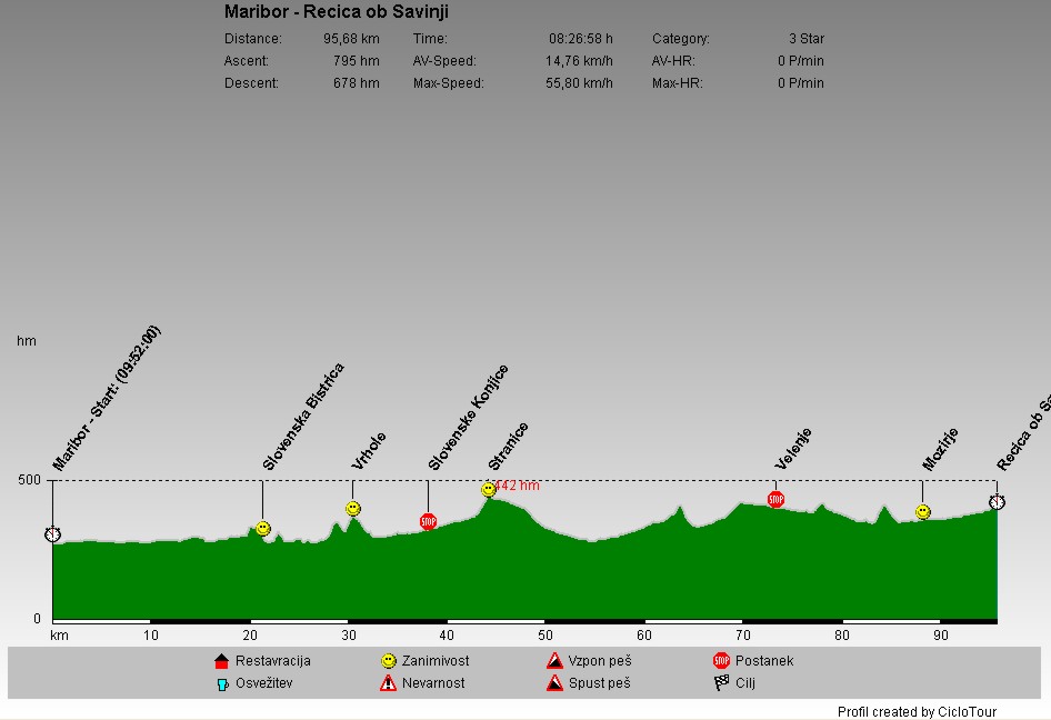| Maribor sem zapustil v smeri Hoč, nato pa nadaljeval pot skozi Slovensko Bistrico in Slovenske Konjice do Vojnika. Zavil sem proti Dobrni, nato pa nadaljeval pot v Velenje. Od tam pa me je pot vodila do Mozirja in naprej do Rečice ob Savinji, kjer sem prespal. |