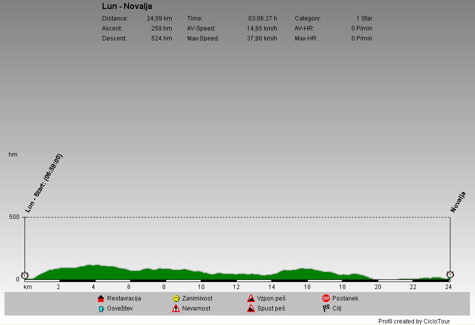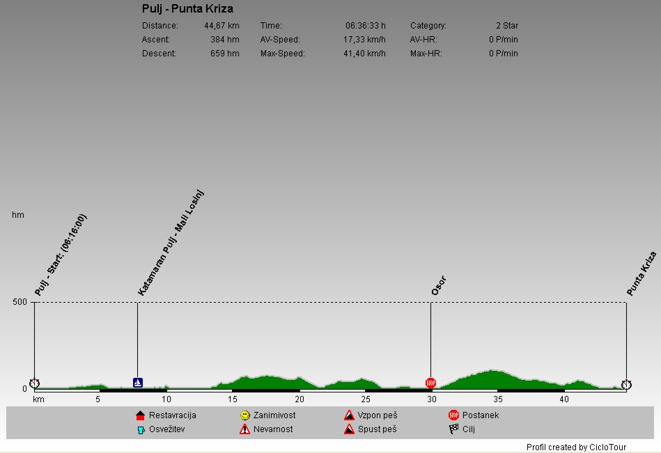 | S kampa Puntižela sem se zapeljal v pristanišče v Pulju. Od tam sem se s katamaranom pripeljal na Mali Lošinj. Kolesaril sem proti Osorju, od tam pa naprej do Punta Križa na Cresu. |